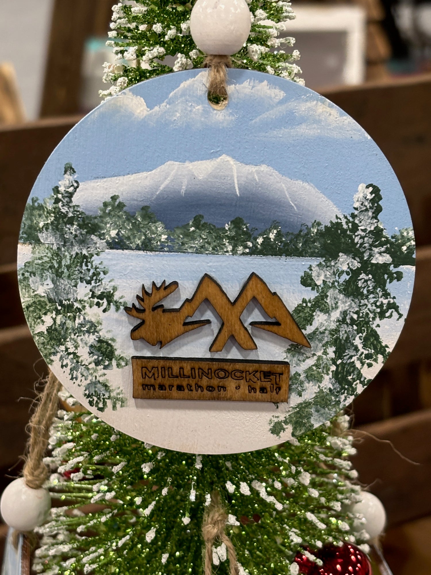 This hand painted wooden ornament celebrates the Millinocket Marathon Half and showcases the iconic Mt. Katahdin. Measuring 4", it's the perfect keepsake for runners and fans alike. Made with attention to detail, this ornament is a unique addition to any holiday collection.