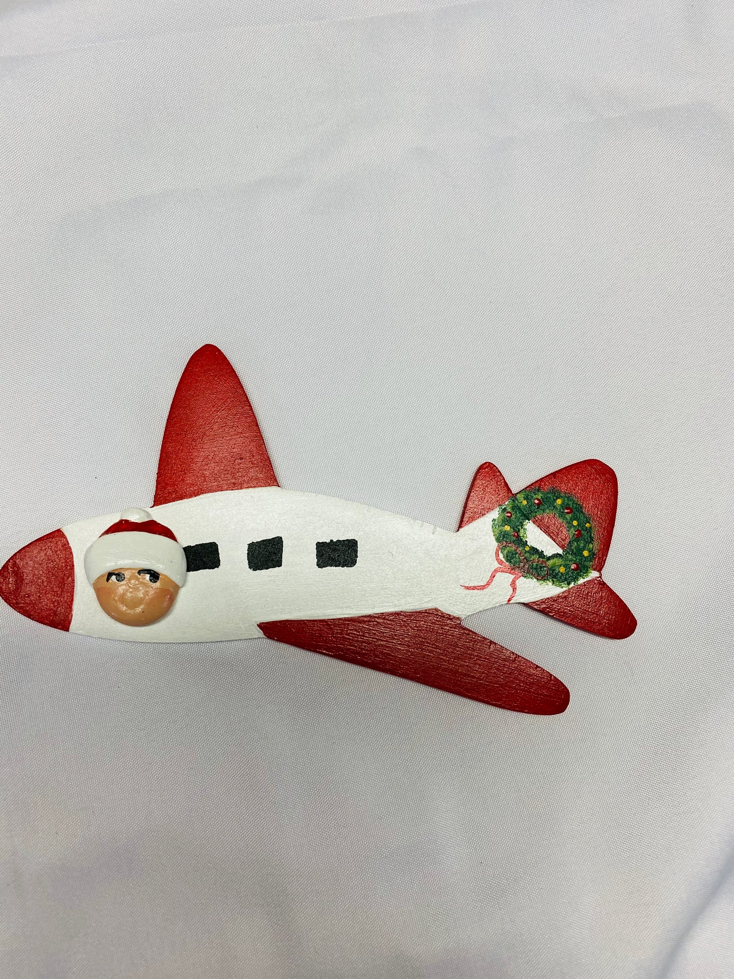 The red and white Airplane measures 4" x 5.5 inches and has a hand painted wreath on the tale. It's make of 1/8" baltic birch and sealed to provide a durable surface. One Santa head has been added to the ornament. It's hand made from polymer clay. The ornament hangs with a wire to allow you to arrange it easily on the branches of your Christmas tree. The body of the airplane and the band on Santa's hat can be personalized.