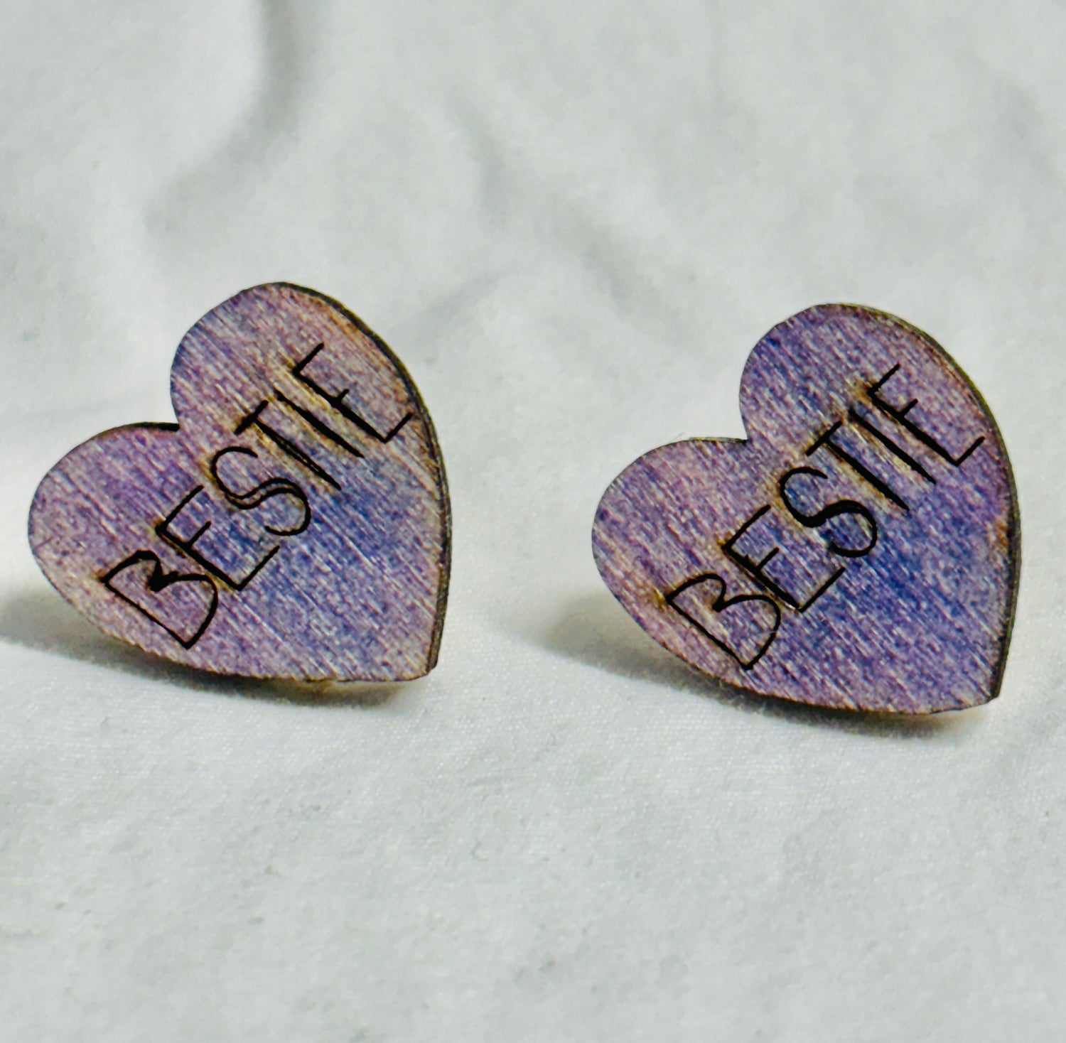 Show your bestie some love with these vibrant word heart stud earrings! Featuring blue and purple watercolor design, these hypoallergenic earrings are nickel free and perfect for everyday wear. Share the love with your BFF and rock these quirky earrings together!