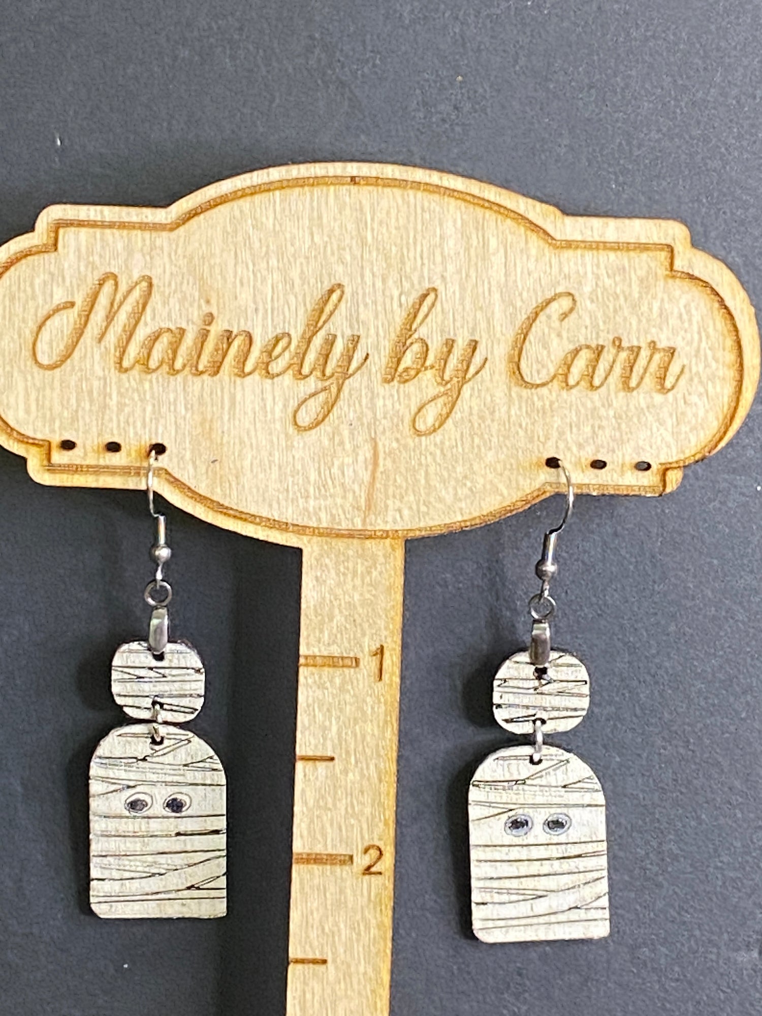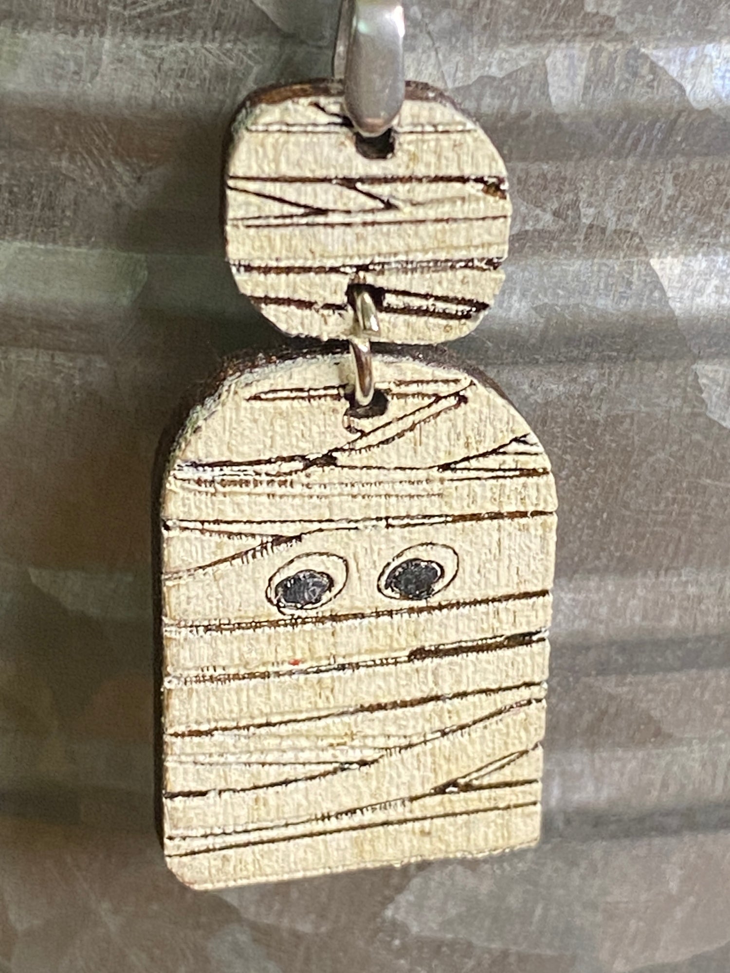 Add a spooky touch to your everyday look with these Boo! Mummie Earrings made from Wood. They feature a two-part dangle design with hand-painted details, making them perfect for any Halloween-themed accessory. Make sure to pick up a pair of these stylish and unique earrings.