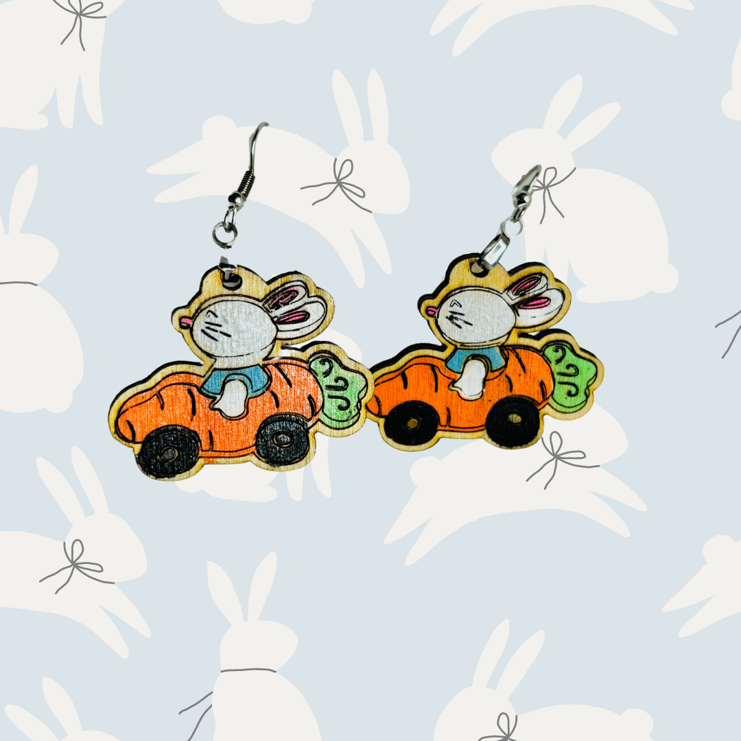 Hop into style with these Carrot Mobile Dangle Earrings! Adorned with a quirky bunny driving a carrot, these premium baltic birch wood earrings are hand painted and feature hypoallergenic earwires for comfortable wear. Perfect for adding a playful touch to any outfit.