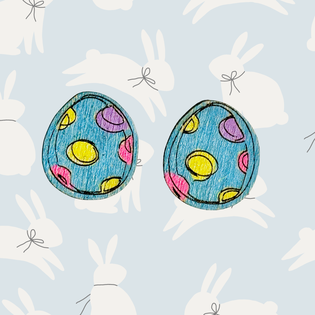 "Get ready for an egg-cellent look with these quirky Dotted Easter Egg Stud Earrings. Featuring hand-painted designs in turquoise, purple, yellow, and hot pink, these hypoallergenic earrings are sure to add a playful touch to your Easter outfit. Hop to it and grab a pair today!"