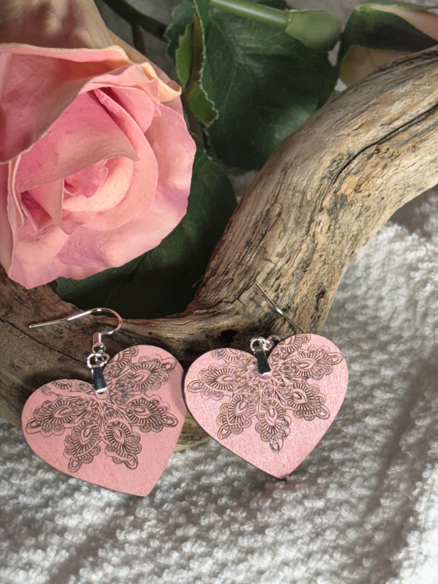 Indulge in luxury with our Dusty Rose Heart Mandala Earrings. Crafted with intricate mandala designs on made from wood, these dangle earrings exude elegance and sophistication. The dusty rose hue adds a touch of femininity to any outfit, making these earrings a must-have accessory for the stylish and exclusive.