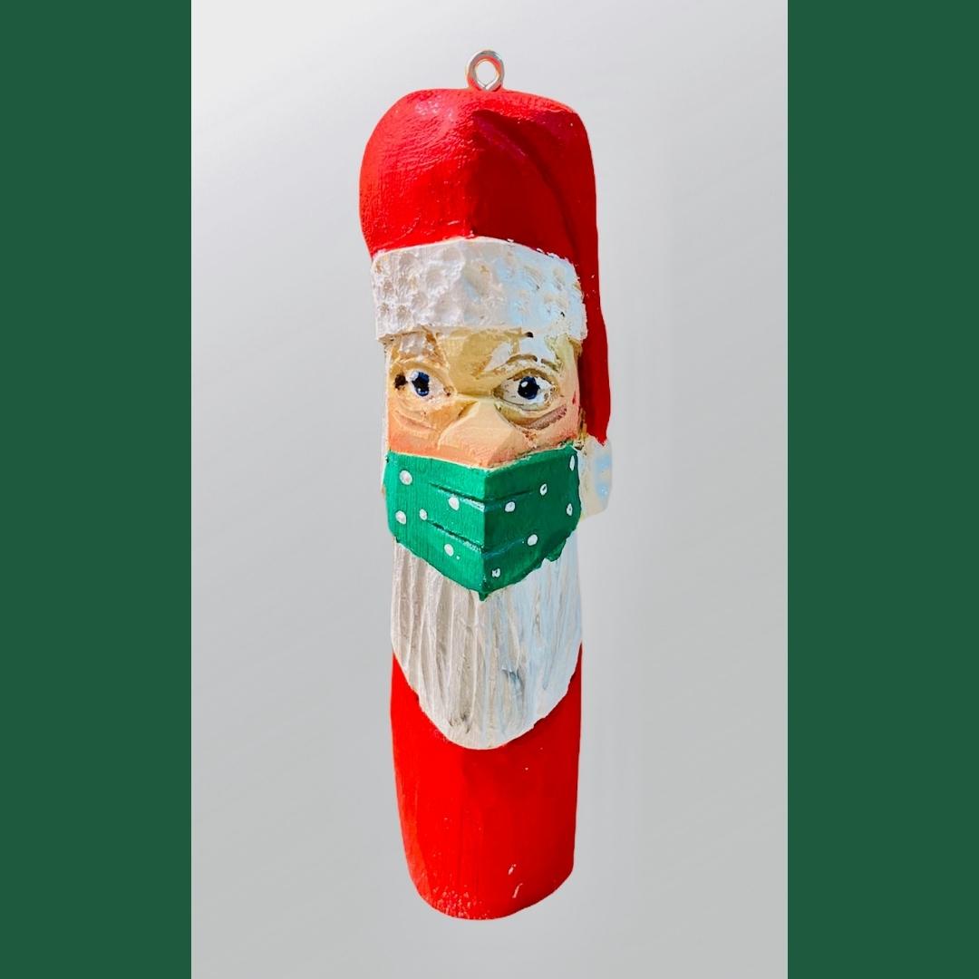 Hand Carved 4" Santa Claus wearing a green face mask with white dots and a long red stocking hat with a white band Hanging Christmas Tree Ornament . The ornament has been created from basswood grown in Maine.