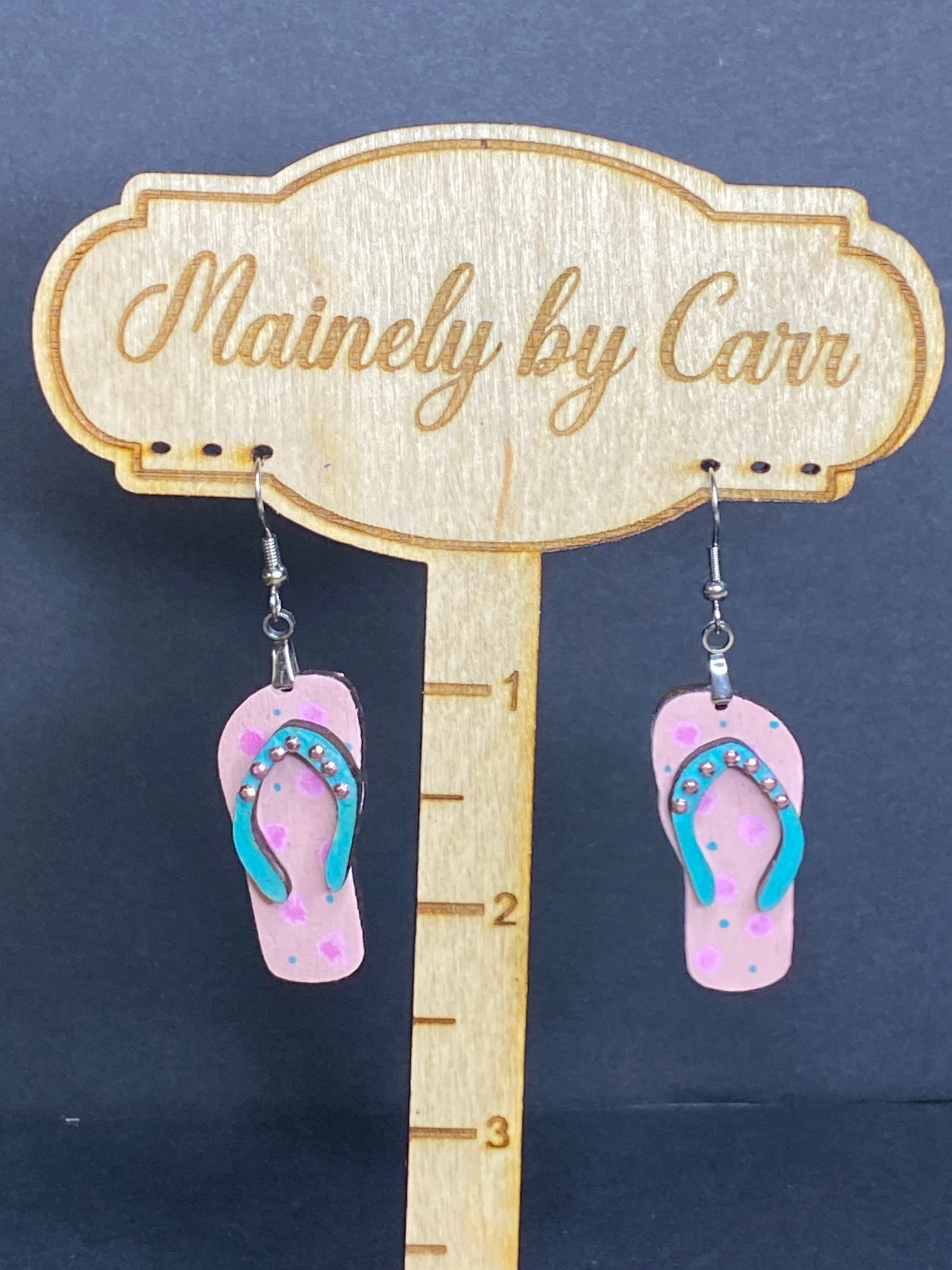 Hand painted Pink Flip Flop Earrings with Dots and Gems