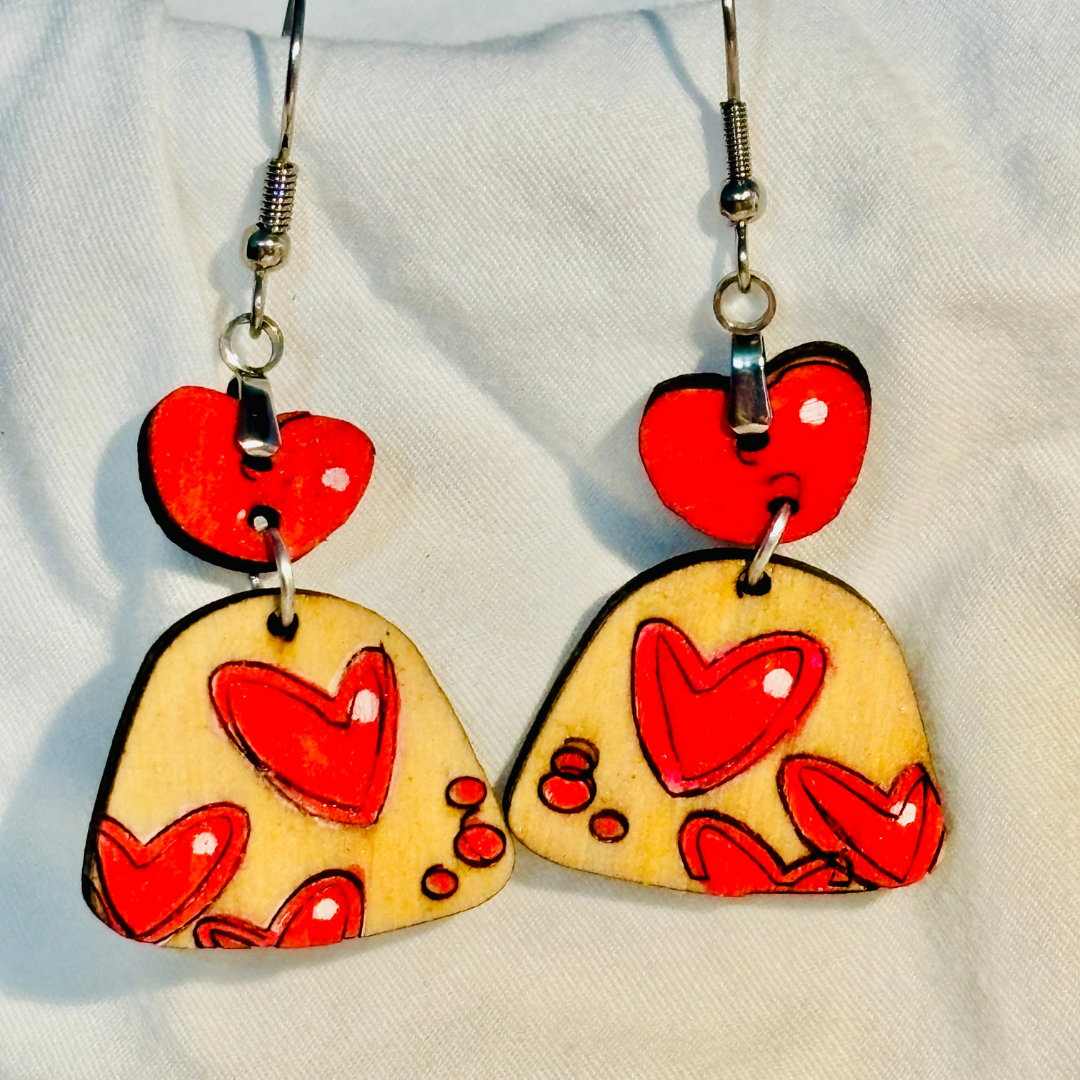 Spice up your outfit with Hearts & More Hearts Dangle Earrings! These unique earrings feature a stained background with bright red hearts, hand painted on premium baltic birch. The hypoallergenic ear wires make them safe for all ears, and their light weight ensures comfort all day (or night) long.