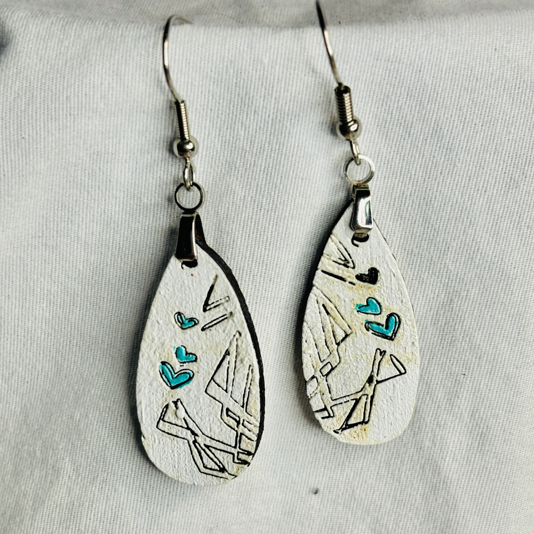 Get your heart on with these unique earrings! Made with premium baltic birch, each long teardrop earring features turquoise hearts and black lines on a white background. Hypoallergenic ear wires make them perfect for sensitive ears. Hand painted with love.