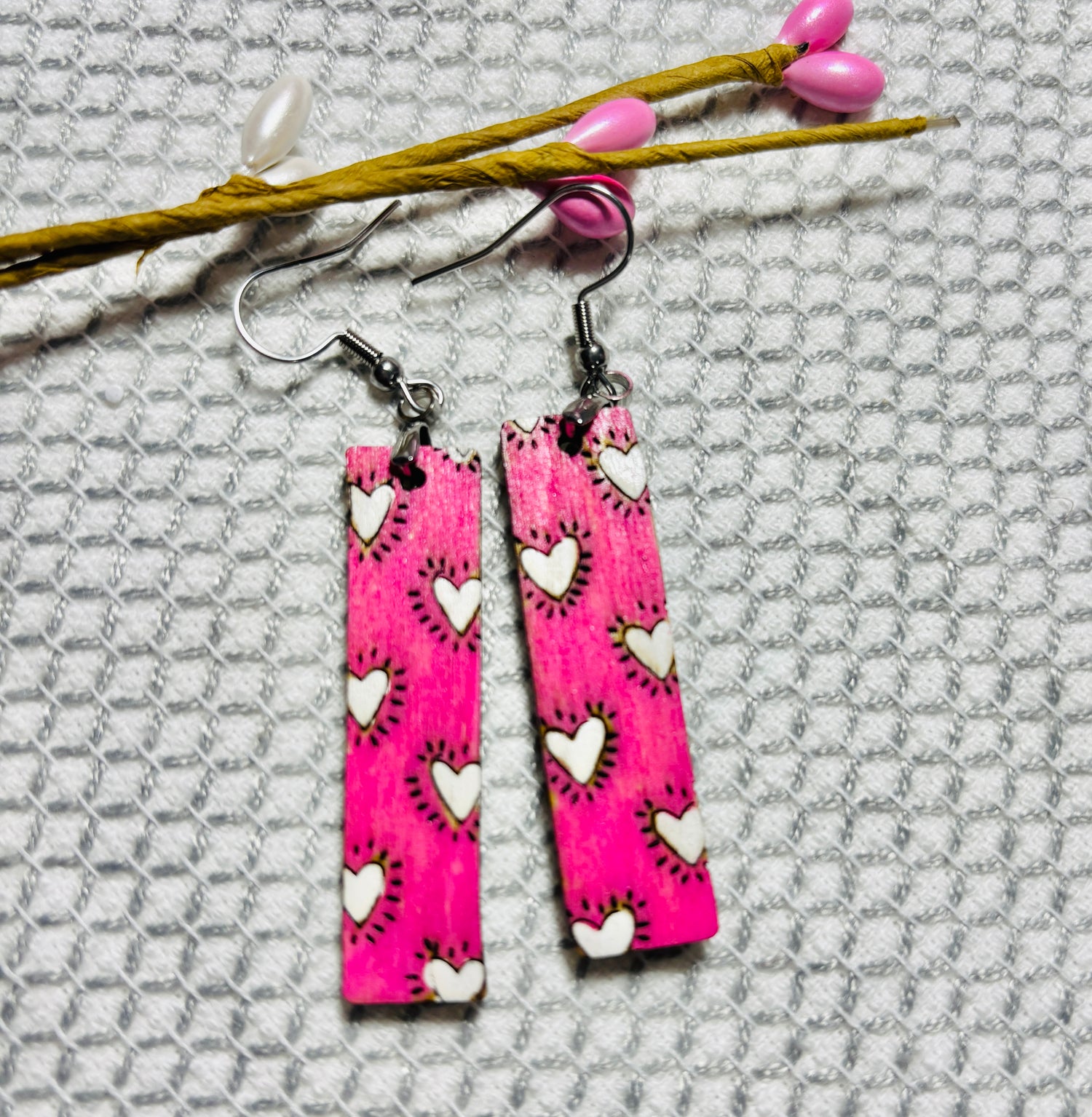 Add a pop of color to your outfit with these heart-shaped hot pink and white wooden bar earrings. Show your playful side with these quirky and fun earrings that will surely catch attention. (And compliments!)
