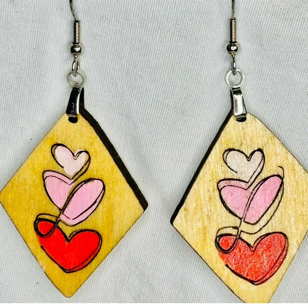 "Fall in love with these Linked Hearts earrings! Made with premium baltic birch and hypoallergenic ear wires, they're as light as a heart's whisper. The linked hearts design and diamond shape add a touch of romance, while the stained background adds a unique touch. Perfect for any occasion!"
