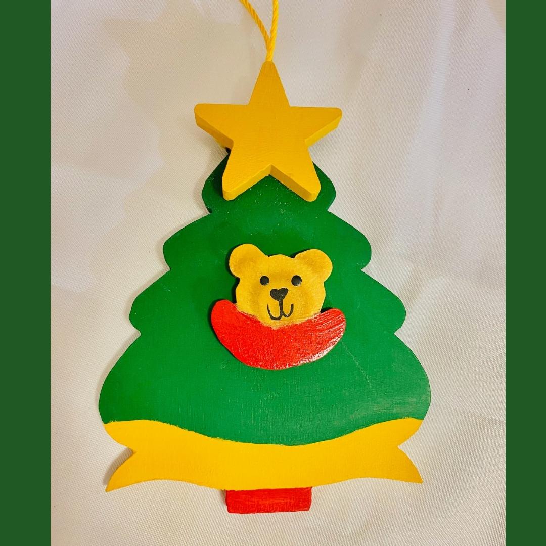 Personalized Christmas tree ornament with Teddy Bear face. This Hanging Christmas Tree Ornament measures 4.5" x 3.5". The tree is hand painted green, with a red base, golden yellow banner and star. The tree has a yellow cord for immediate display. Teddy Bear faces come with a red or white collar for personalization. The ornament has been created from baltic birch A thin coat of seal helps preserve the ornament for years to come.