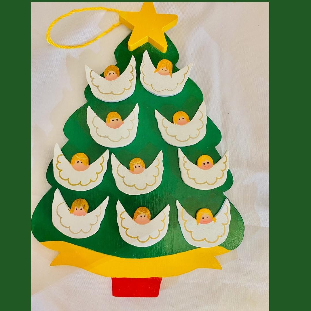 Personalized Christmas tree ornament with 10 Angels. This Hanging Christmas Tree Ornament measures 7.5" x 6" . The tree is hand painted green, with a red base, golden yellow banner and star. The tree has a yellow cord for immediate display Angels' wings are used for personalization. The ornament has been created from baltic birch A thin coat of seal helps preserve the ornament for years to come.