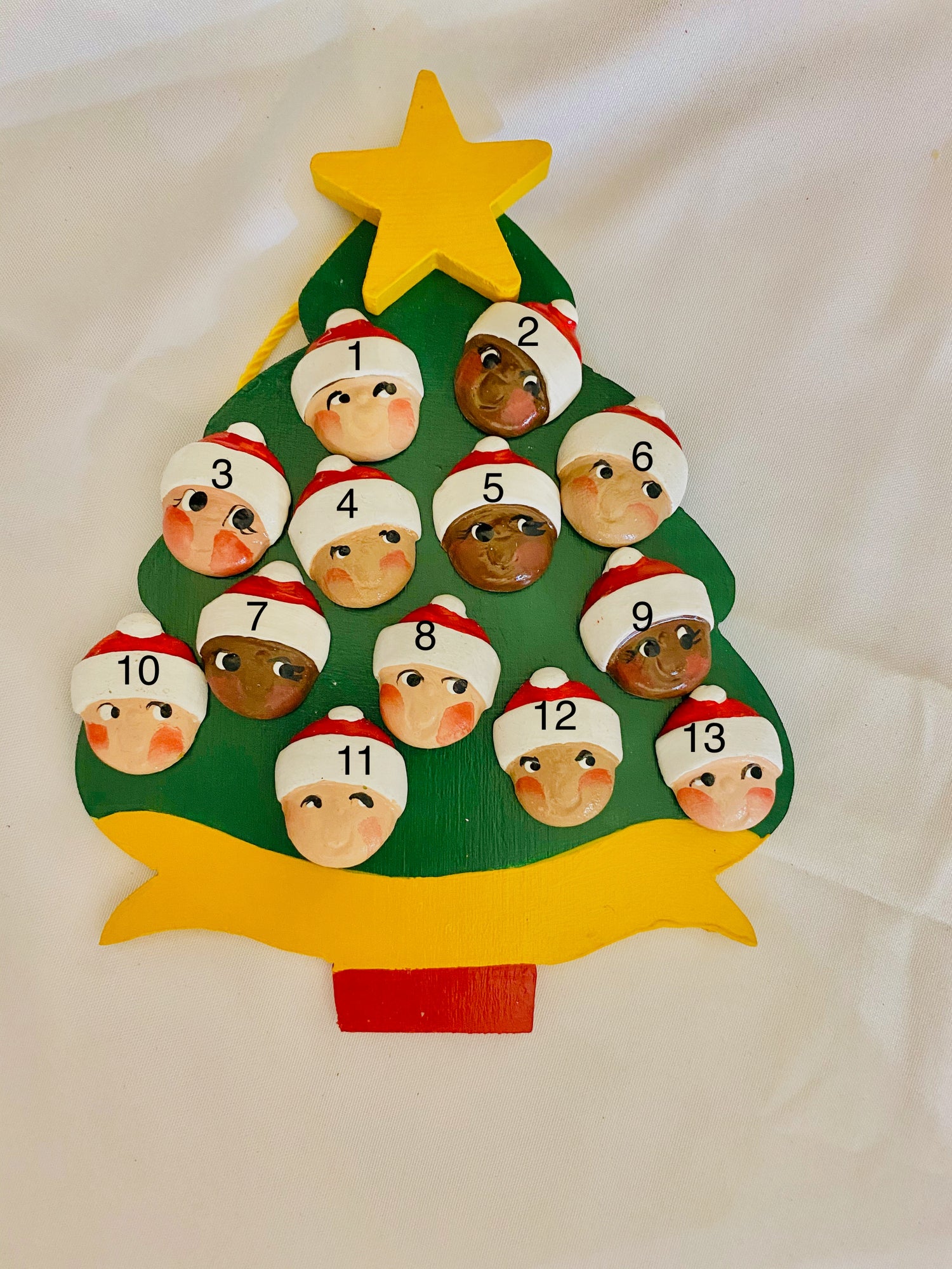 Personalized Christmas tree ornament with Santa faces. This Hanging Christmas Tree Ornament measures 6" x 4.5". The tree is hand painted green, with a red base, golden yellow banner and star. The tree has a yellow cord for immediate display. Santa faces come with a red hat with a white band. The faces are available in 3 skin tone - light, medium and dark. The ornament has been created from baltic birch (tree and star) and sculptured clay(Santa faces). A thin coat of seal helps preserve the ornament for years to come.