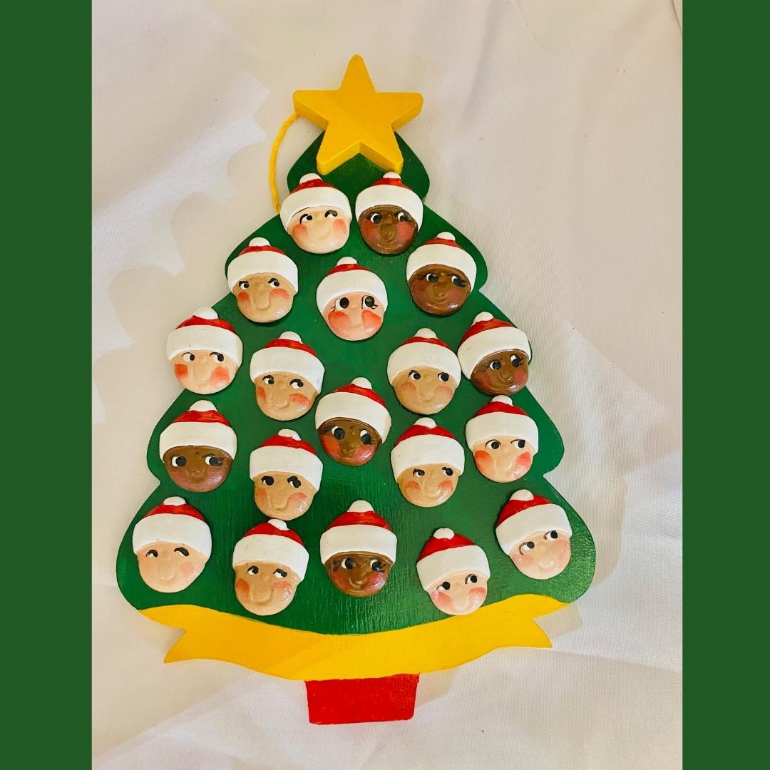 Personalized Christmas tree ornament with Santa faces. This Hanging Christmas Tree Ornament measures 7.5' x 6". The tree is hand painted green, with a red base, golden yellow banner and star. The tree has a yellow cord for immediate display. Santa faces come with a red hat with a white band. The faces are available in 3 skin tone - light, medium and dark. The ornament has been created from baltic birch (tree and star) and sculptured clay(Santa faces). A thin coat of seal helps preserve the ornament for years to come.