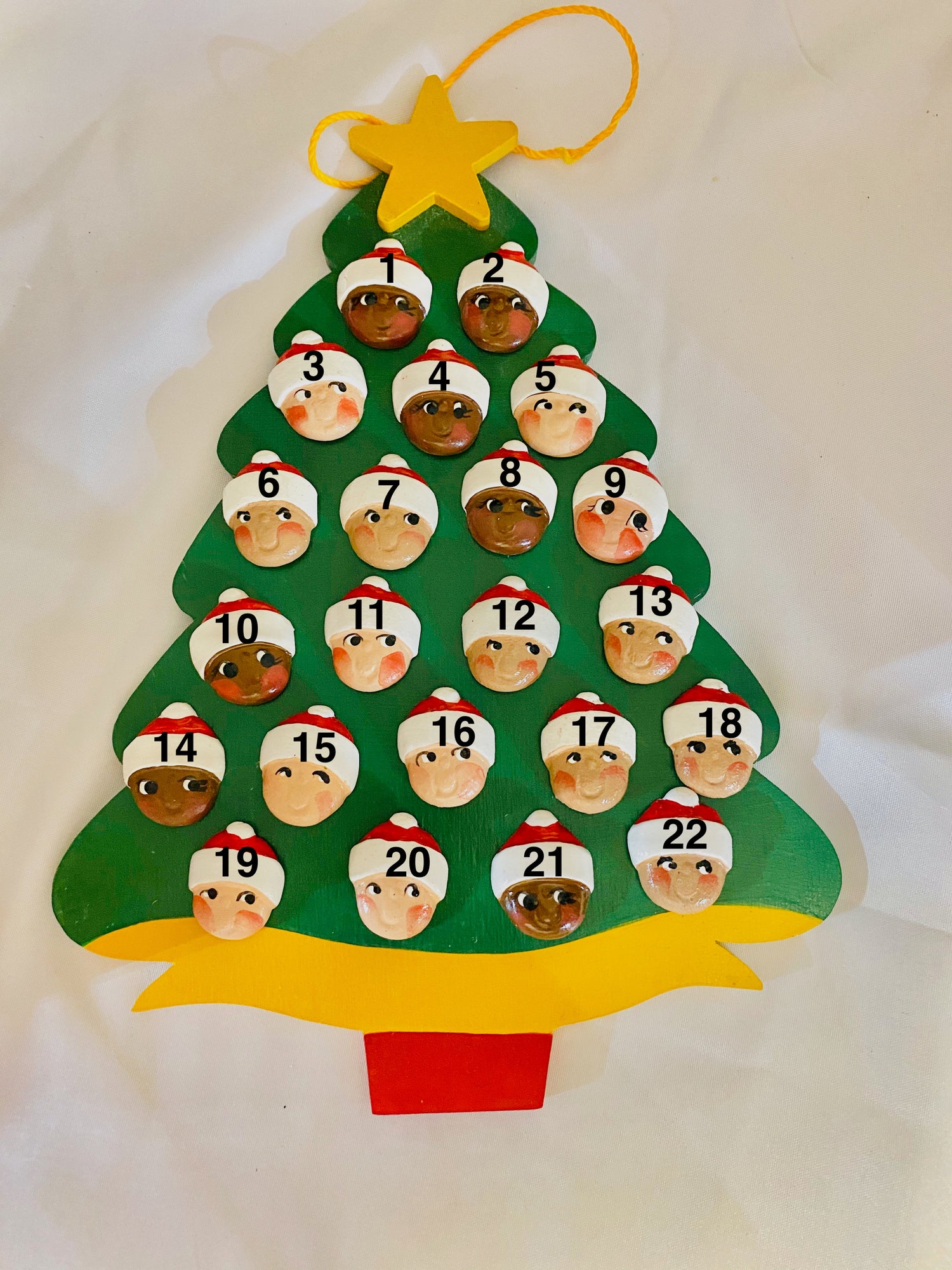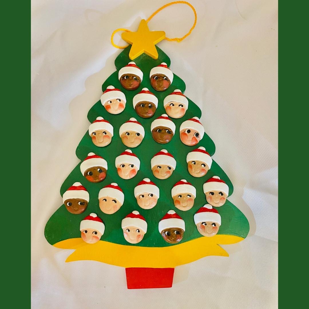 Personalized Christmas tree ornament with Santa faces. This Hanging Christmas Tree Ornament measures 8.5" x 7". The tree is hand painted green, with a red base, golden yellow banner and star. The tree has a yellow cord for immediate display. Santa faces come with a red hat with a white band. The faces are available in 3 skin tone - light, medium and dark. The ornament has been created from baltic birch (tree and star) and sculptured clay(Santa faces). A thin coat of seal helps preserve the ornament for years to come.