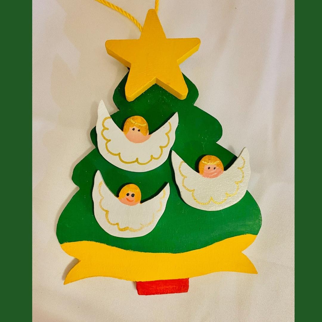 Personalized Christmas tree ornament with 3 Angels. This Hanging Christmas Tree Ornament measures 4.5" x 3.5". The tree is hand painted green, with a red base, golden yellow banner and star. The tree has a yellow cord for immediate display Angels' wings are used for personalization. The ornament has been created from baltic birch A thin coat of seal helps preserve the ornament for years to come.