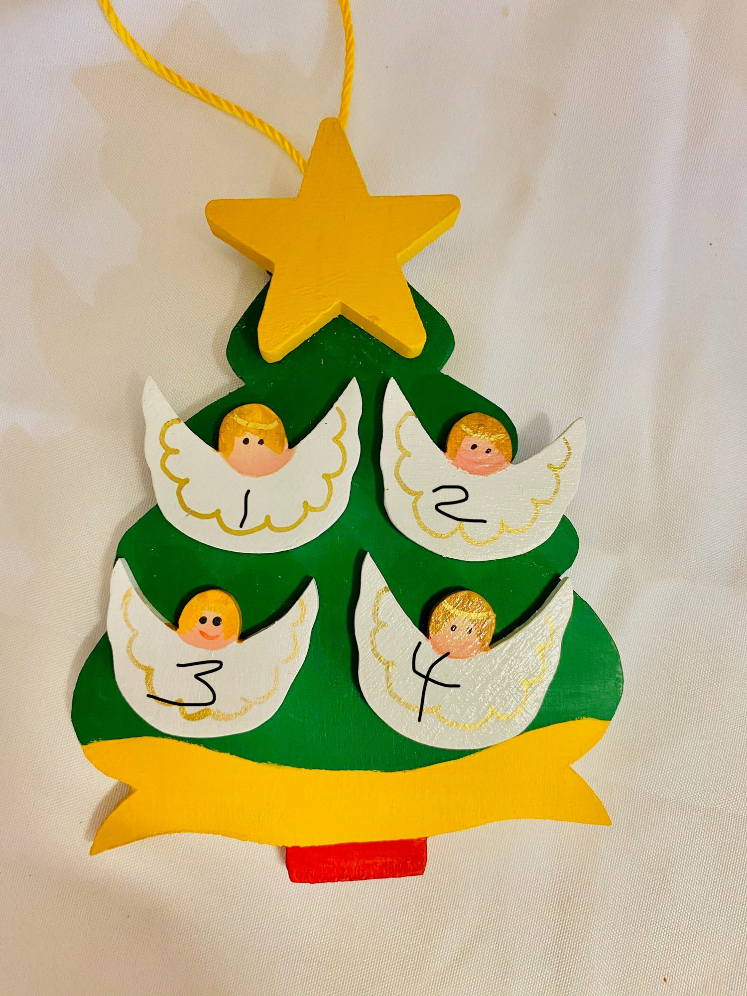Personalized Christmas tree ornament with 4 Angels. This Hanging Christmas Tree Ornament measures 4.5" x 3.5". The tree is hand painted green, with a red base, golden yellow banner and star. The tree has a yellow cord for immediate display Angels' wings are used for personalization. The ornament has been created from baltic birch A thin coat of seal helps preserve the ornament for years to come.