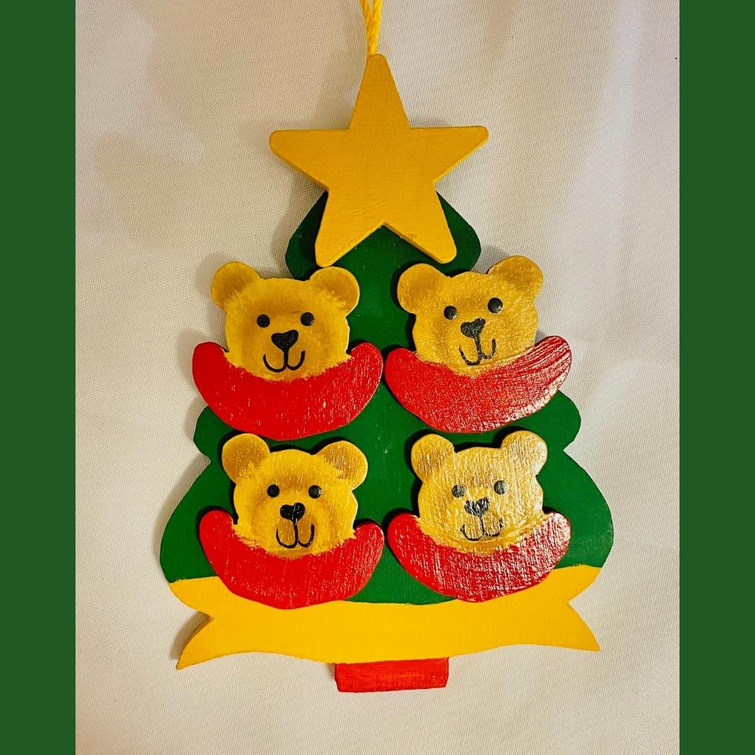 Personalized Christmas tree ornament with Teddy Bear faces. This Hanging Christmas Tree Ornament measures 4.5" x 3.5". The tree is hand painted green, with a red base, golden yellow banner and star. The tree has a yellow cord for immediate display. Teddy Bear faces come with a red or white collar for personalization. The ornament has been created from baltic birch A thin coat of seal helps preserve the ornament for years to come.