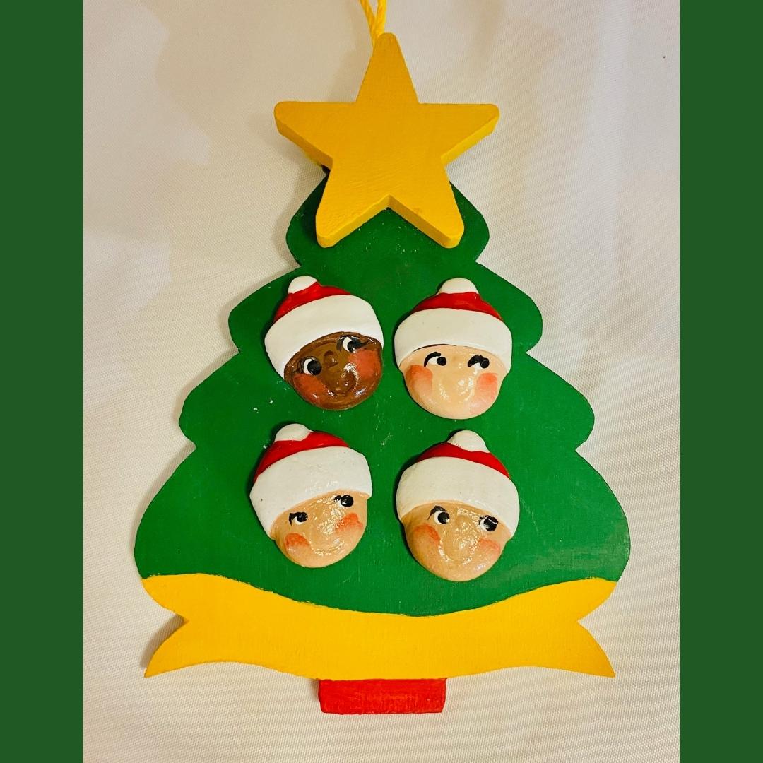 Personalized Christmas tree ornament with Santa faces. This Hanging Christmas Tree Ornament measures 4.5" x 3.5". The tree is hand painted green, with a red base, golden yellow banner and star. The tree has a yellow cord for immediate display. Santa faces come with a red hat with a white band. The faces are available in 3 skin tone - light, medium and dark. The ornament has been created from baltic birch (tree and star) and sculptured clay(Santa faces). A thin coat of seal helps preserve the ornament for years to come.