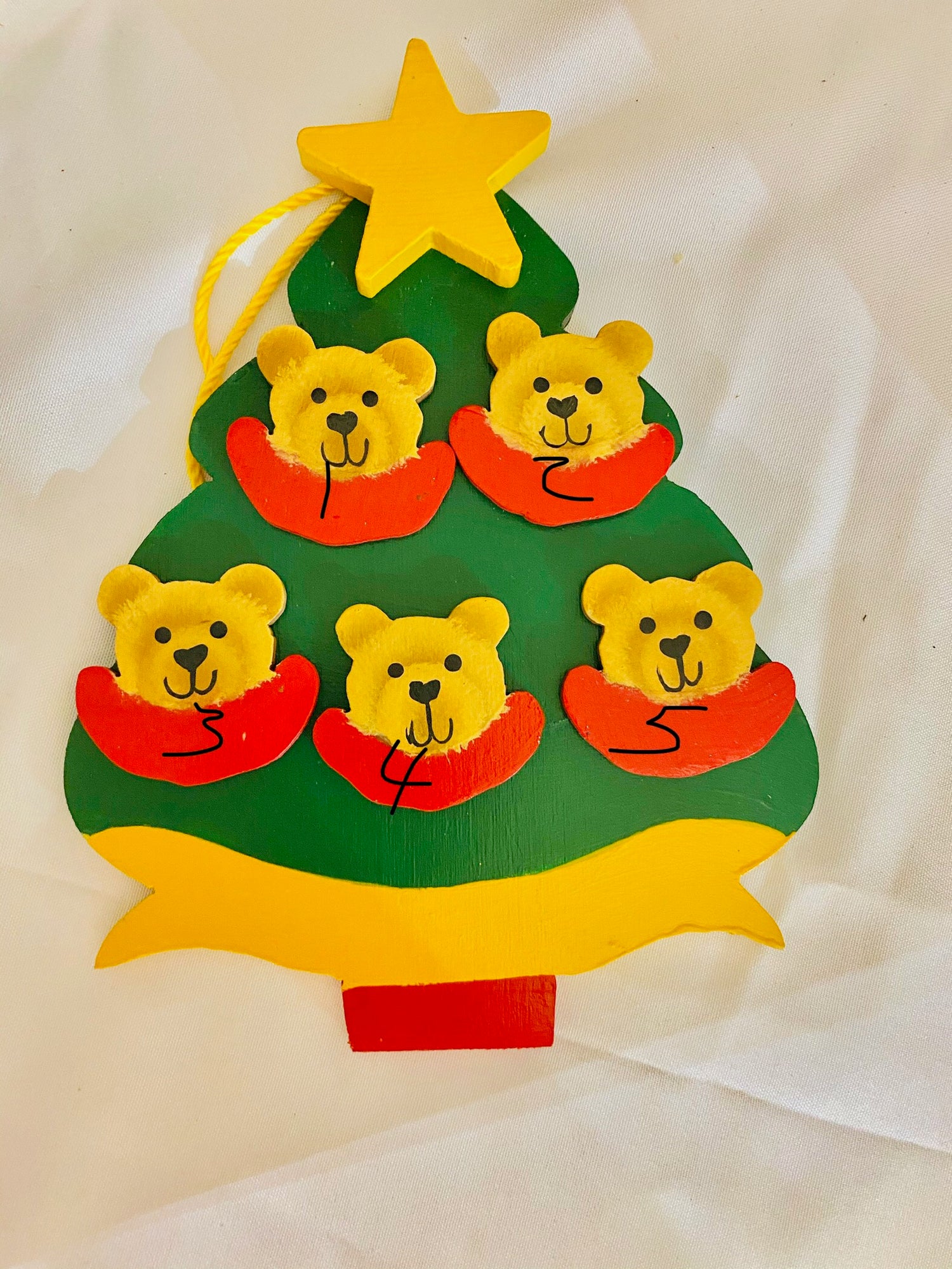 Personalized Christmas tree ornament with Teddy Bear faces. This Hanging Christmas Tree Ornament measures 6" x 4.5". The tree is hand painted green, with a red base, golden yellow banner and star. The tree has a yellow cord for immediate display. Teddy Bear faces come with a red or white collar for personalization. The ornament has been created from baltic birch A thin coat of seal helps preserve the ornament for years to come.
