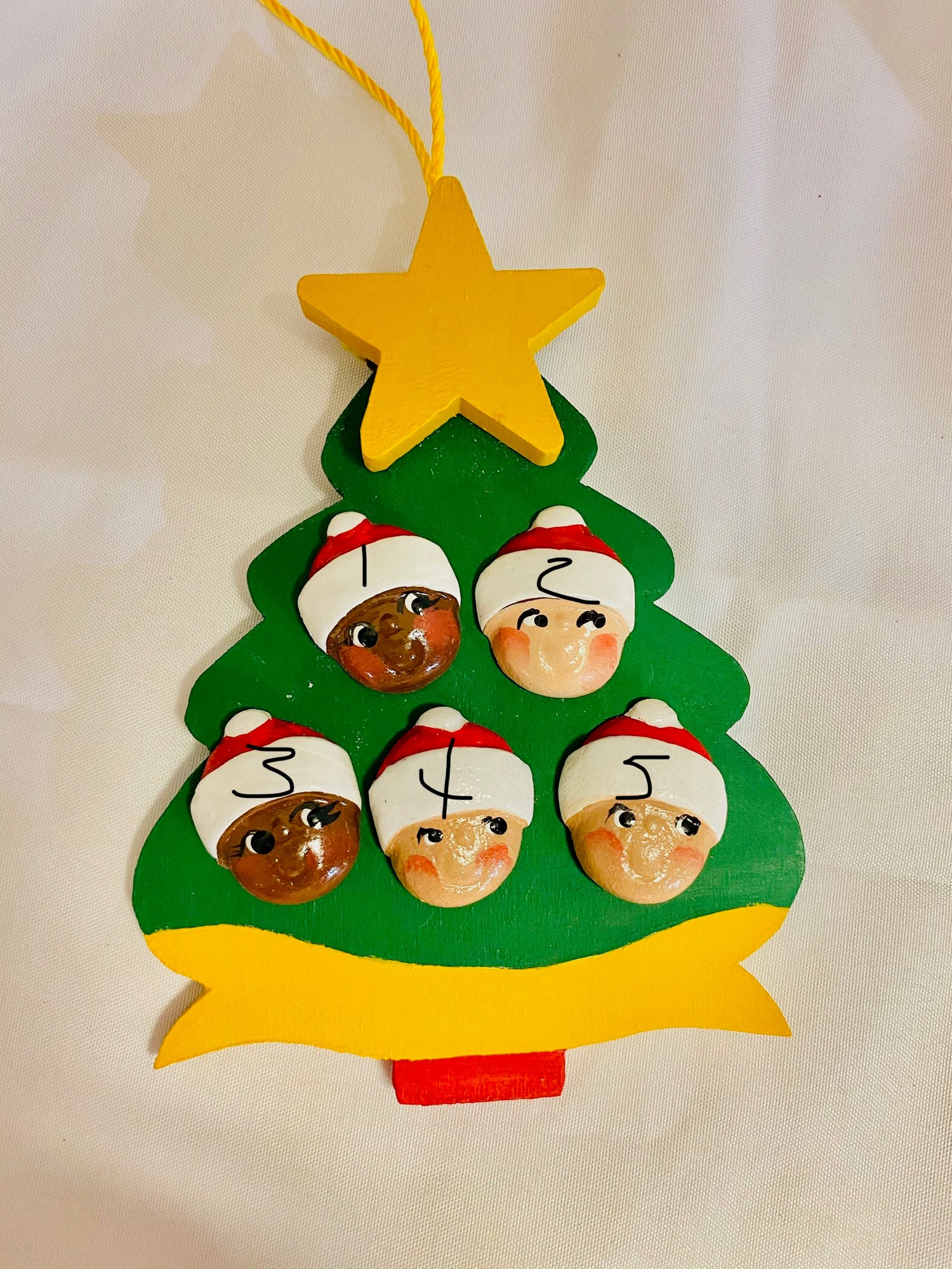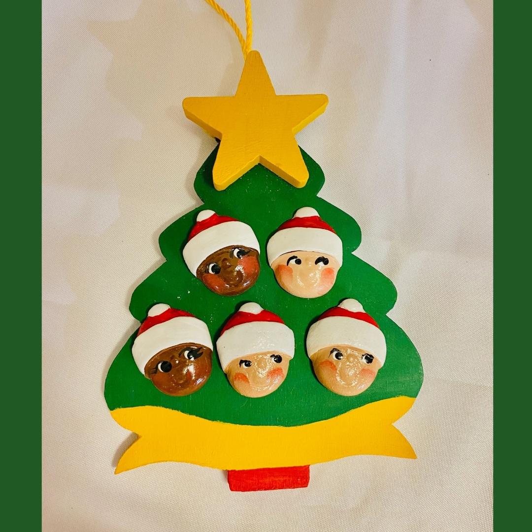 Personalized Christmas tree ornament with Santa faces. This Hanging Christmas Tree Ornament measures 4.5" x 3.5". The tree is hand painted green, with a red base, golden yellow banner and star. The tree has a yellow cord for immediate display. Santa faces come with a red hat with a white band. The faces are available in 3 skin tone - light, medium and dark. The ornament has been created from baltic birch (tree and star) and sculptured clay(Santa faces). A thin coat of seal helps preserve the ornament for years to come.