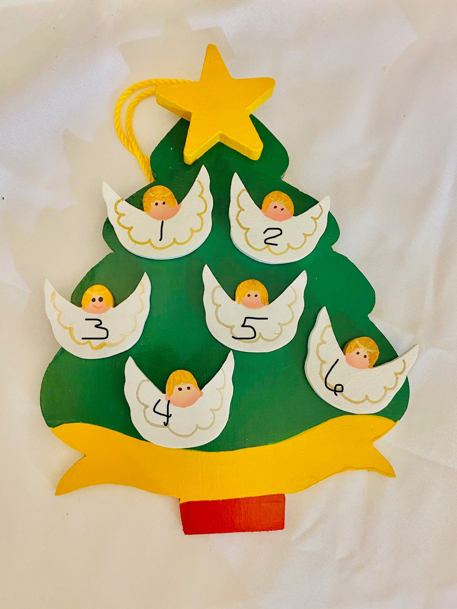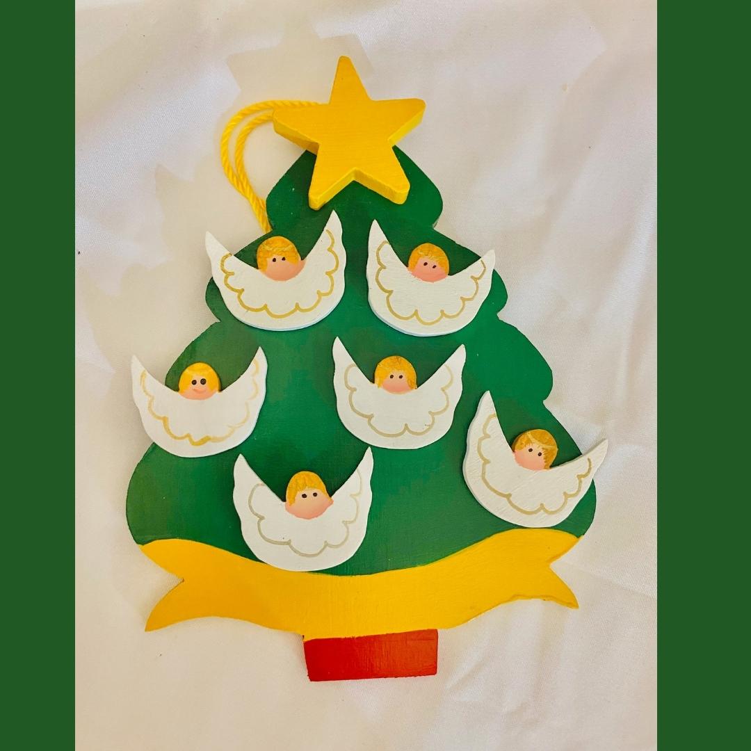 Personalized Christmas tree ornament with 6 Angels. This Hanging Christmas Tree Ornament measures 6" x 4.5" . The tree is hand painted green, with a red base, golden yellow banner and star. The tree has a yellow cord for immediate display Angels' wings are used for personalization. The ornament has been created from baltic birch A thin coat of seal helps preserve the ornament for years to come.