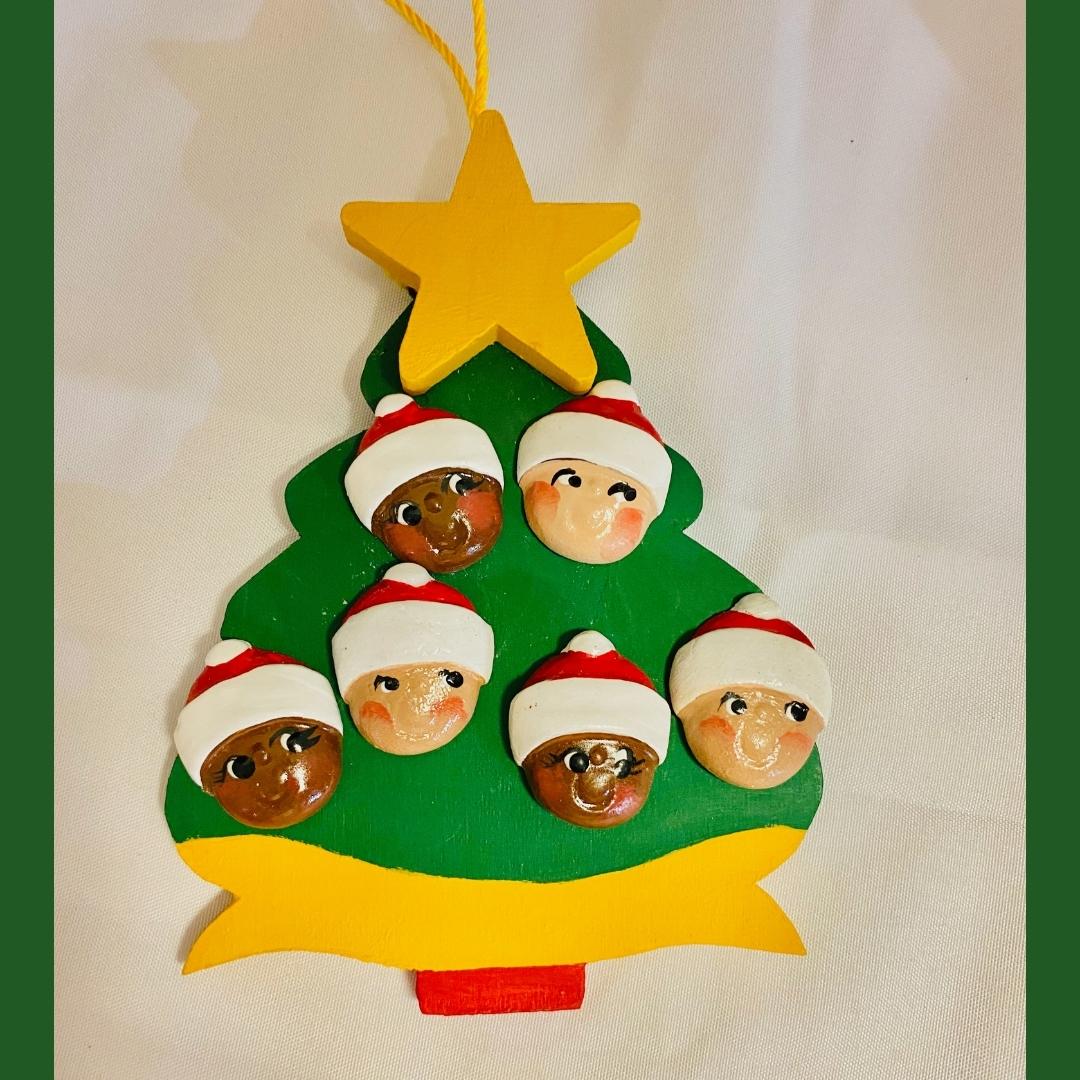 Personalized Christmas tree ornament with Santa faces. This Hanging Christmas Tree Ornament measures 4.5" x 3.5". The tree is hand painted green, with a red base, golden yellow banner and star. The tree has a yellow cord for immediate display. Santa faces come with a red hat with a white band. The faces are available in 3 skin tone - light, medium and dark. The ornament has been created from baltic birch (tree and star) and sculptured clay(Santa faces). A thin coat of seal helps preserve the ornament for years to come.
