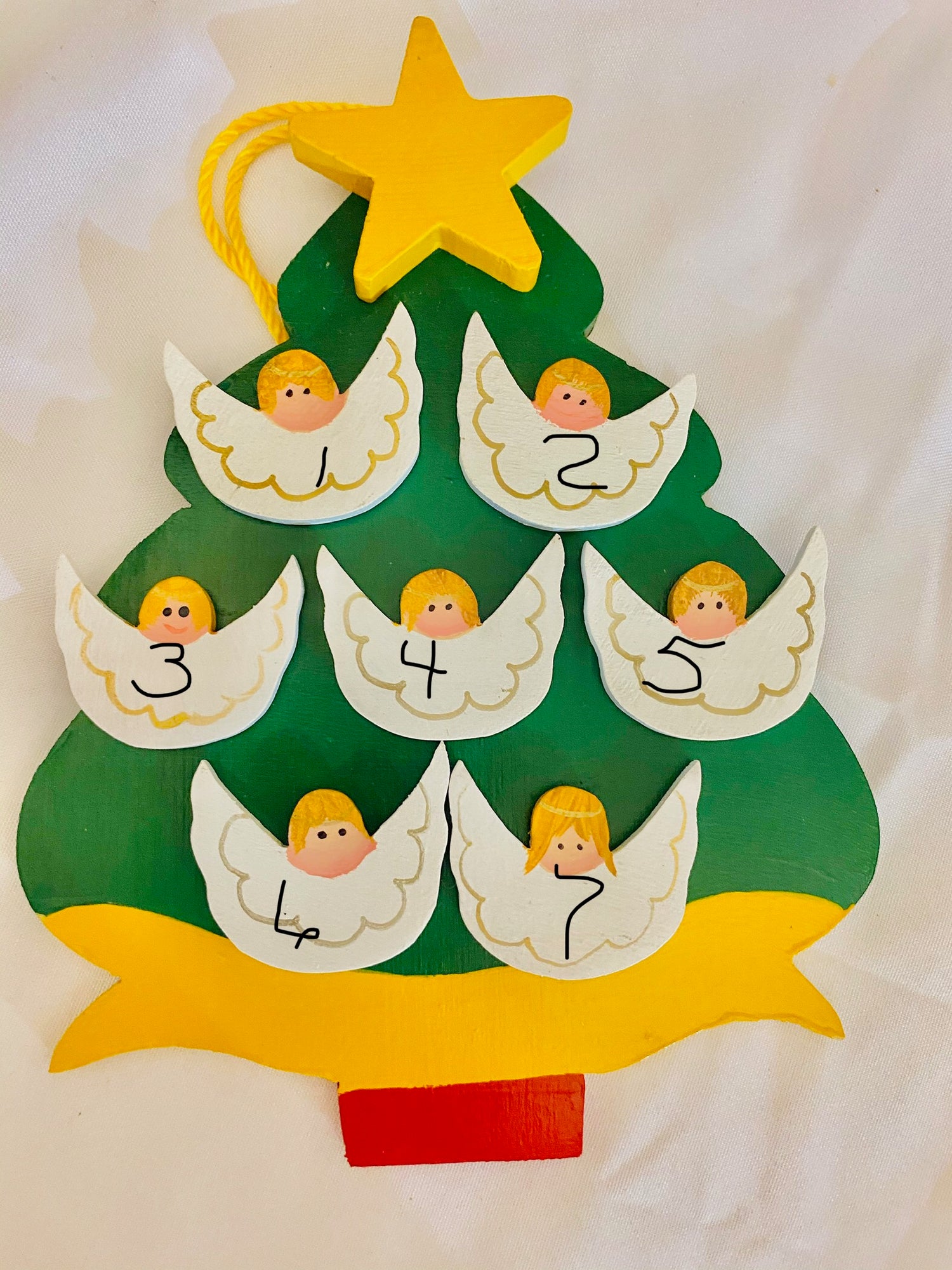 Personalized Christmas tree ornament with 7 Angels. This Hanging Christmas Tree Ornament measures 6" x 4.5" . The tree is hand painted green, with a red base, golden yellow banner and star. The tree has a yellow cord for immediate display Angels' wings are used for personalization. The ornament has been created from baltic birch A thin coat of seal helps preserve the ornament for years to come.