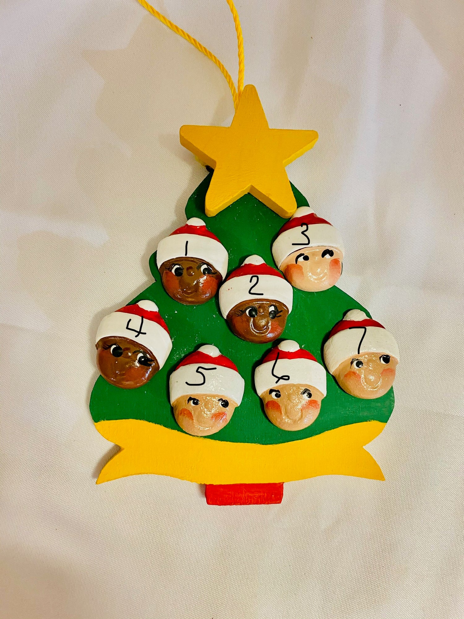 Personalized Christmas tree ornament with Santa faces. This Hanging Christmas Tree Ornament measures 4.5" x 3.5". The tree is hand painted green, with a red base, golden yellow banner and star. The tree has a yellow cord for immediate display. Santa faces come with a red hat with a white band. The faces are available in 3 skin tone - light, medium and dark. The ornament has been created from baltic birch (tree and star) and sculptured clay(Santa faces). A thin coat of seal helps preserve the ornament for years to come.