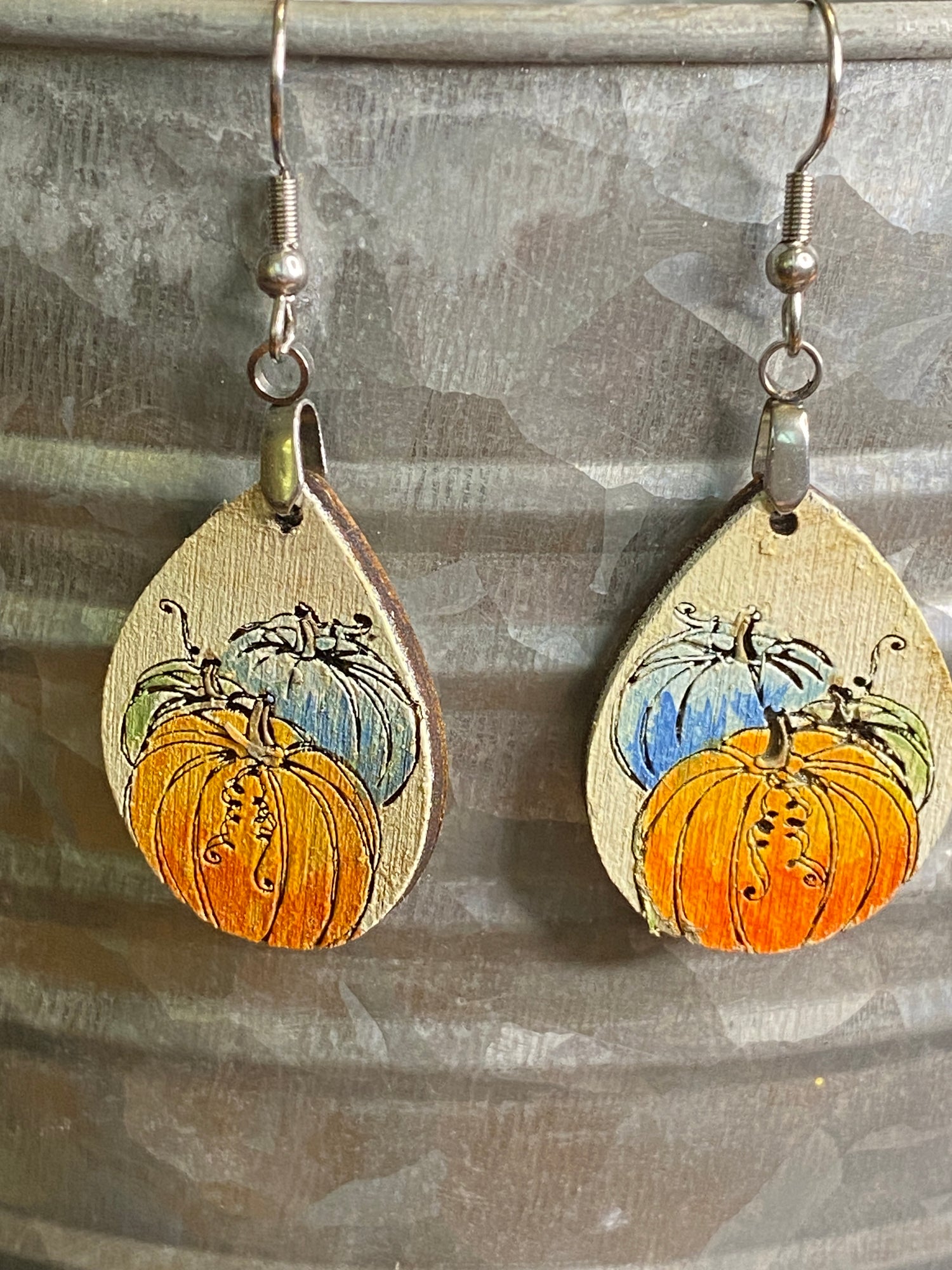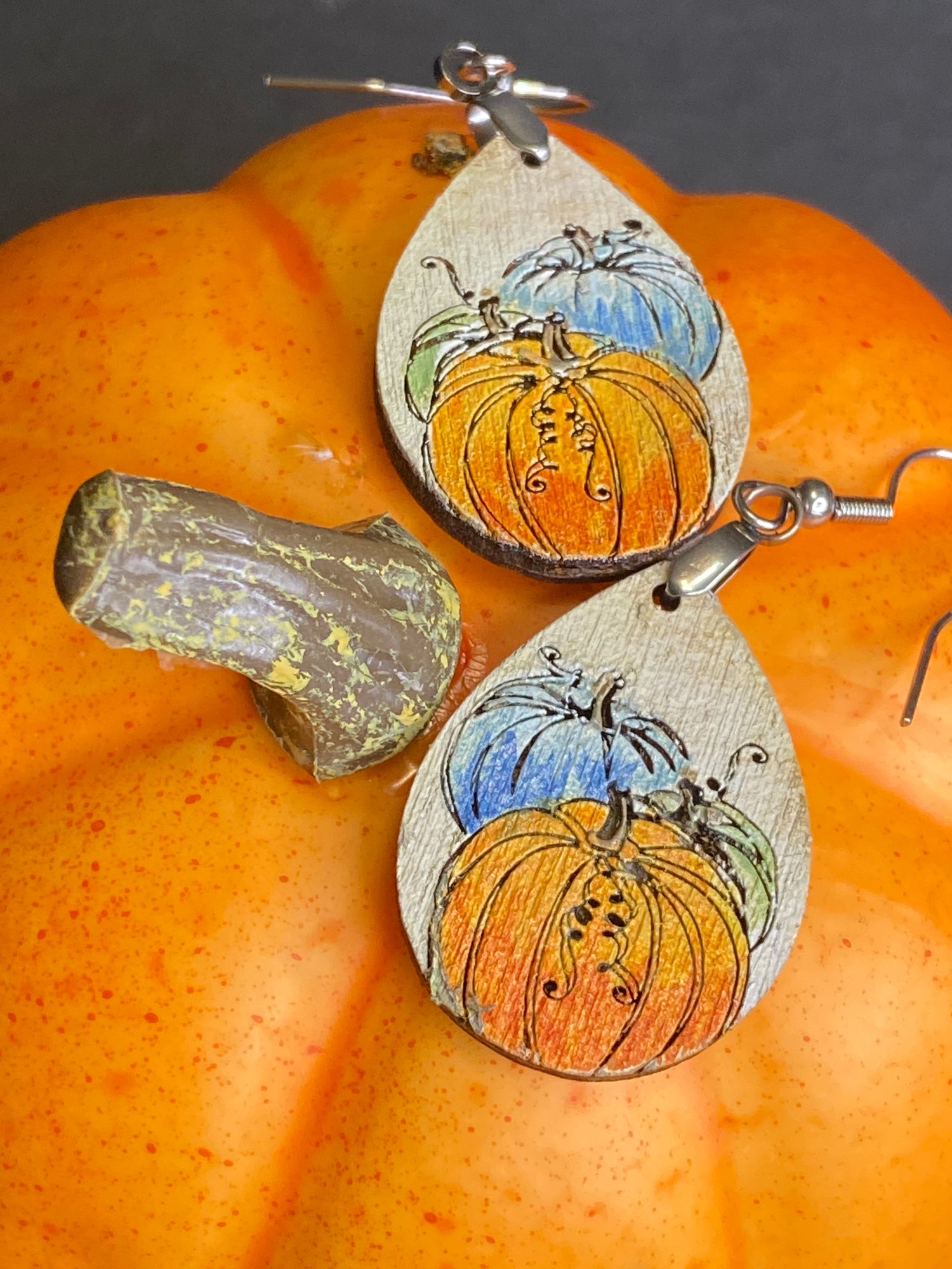 Glamorize your style with these elegant Pumpkin Trio Hand Painted Teardrop Earrings. These hand-painted earrings feature a trio of pumpkins in autumnal shades adorning the teardrop shape. Perfect for adding a sophisticated flair to your ensemble, these earrings will be a conversation piece for any occasion.