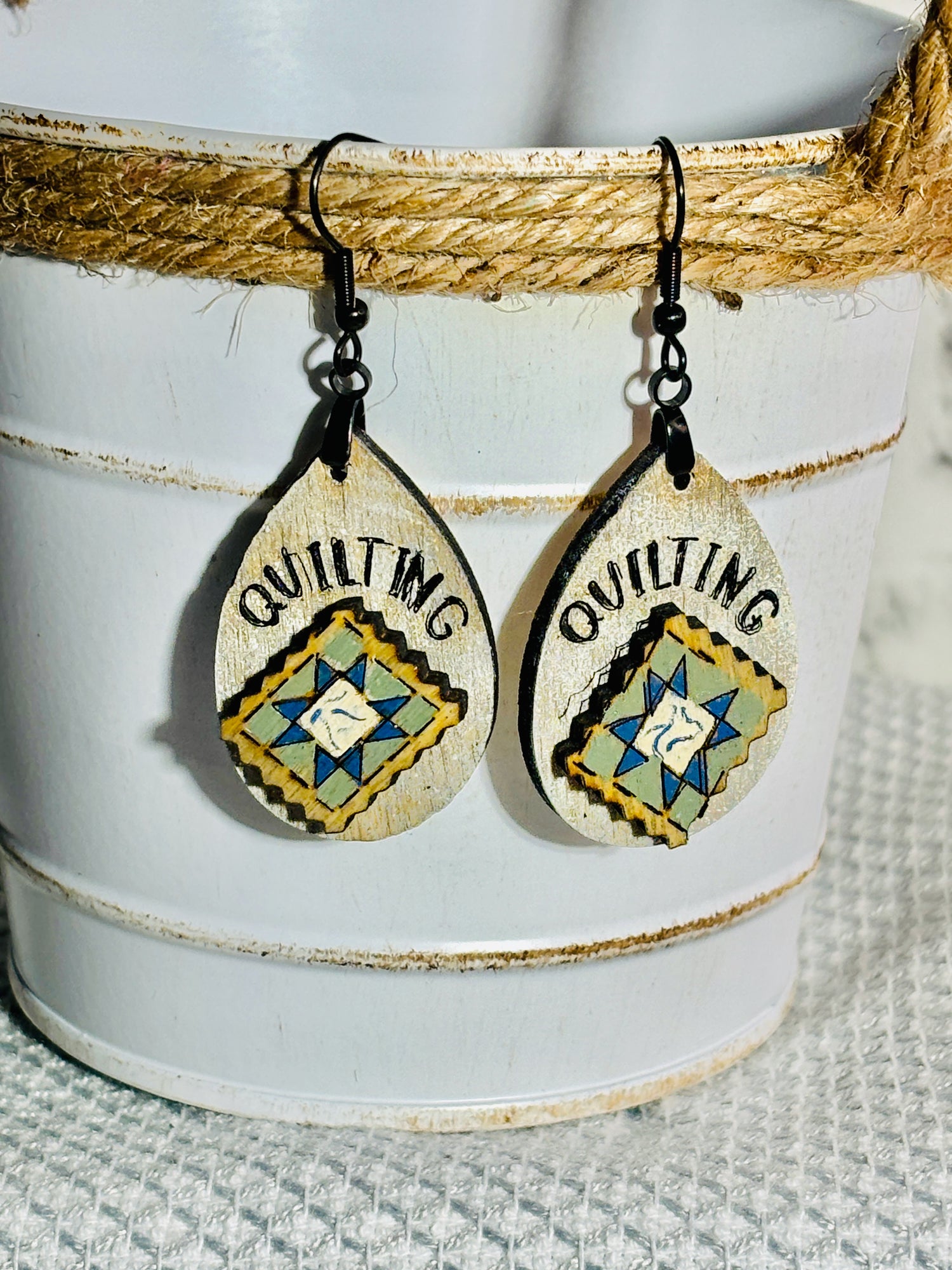 "Add a stitch of style to your wardrobe with these Quilting Dangle Earrings. Crafted from lightweight wood, these hypoallergenic earrings feature quilt-inspired squares in a cool blue, green, and ivory palette. The dry brushed background adds an artsy touch. Perfect for any quilter or anyone looking to add a unique touch to their outfit."