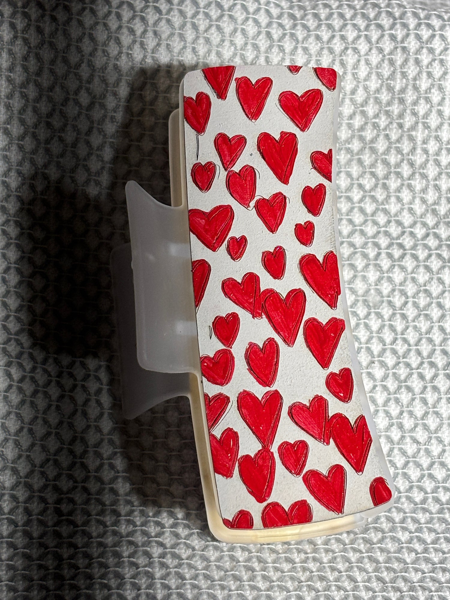 Add some love to your hair with our Red on White 4" Hair Clip! This hand painted clip features playful red hearts against a white background. At 4 inches, it's the perfect size to add a pop of color to any hairstyle. Now that's clip-tastic!