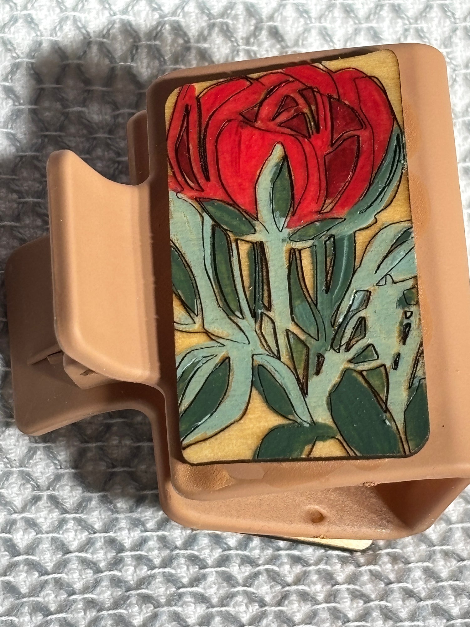 Add a pop of color with our Red Rose 2" Hair Clip. Hand painted with vibrant red petals and detailed green leaves, this hair clip is the perfect accessory to complete your look. (Flower power for your hair!)