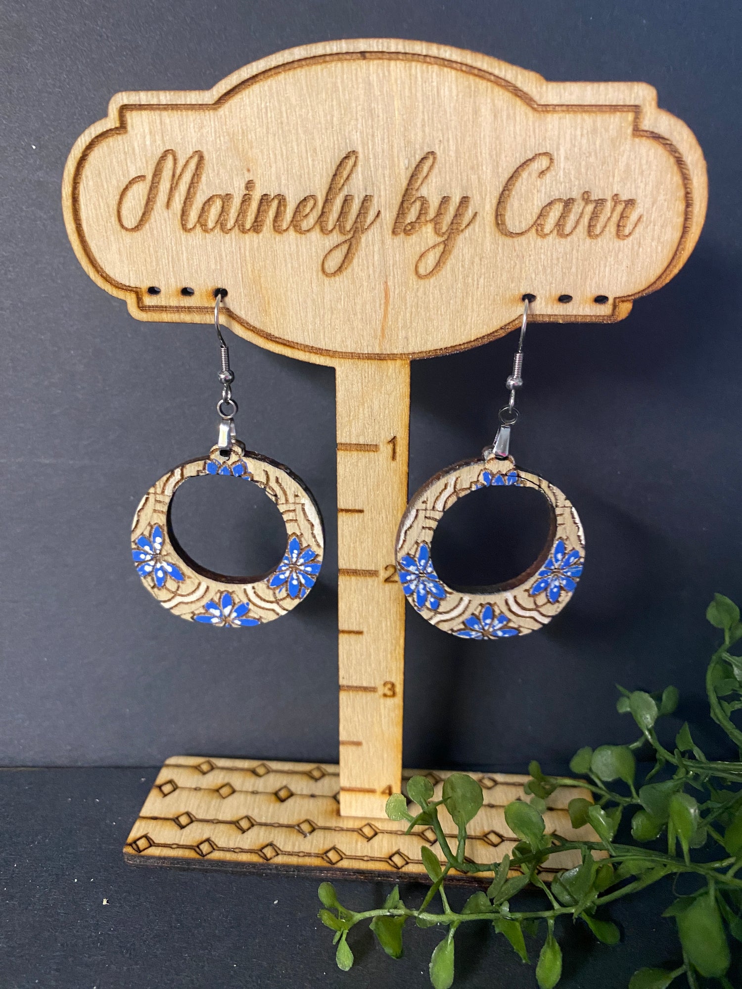 These timeless and unique Ring of Flower Wooden Earrings boast an exquisite design, featuring an engraving of a beautiful flower set against a natural background of subtle royal blue and white hues. Antique and rustic, these pieces bring elegance and sophistication to any outfit.