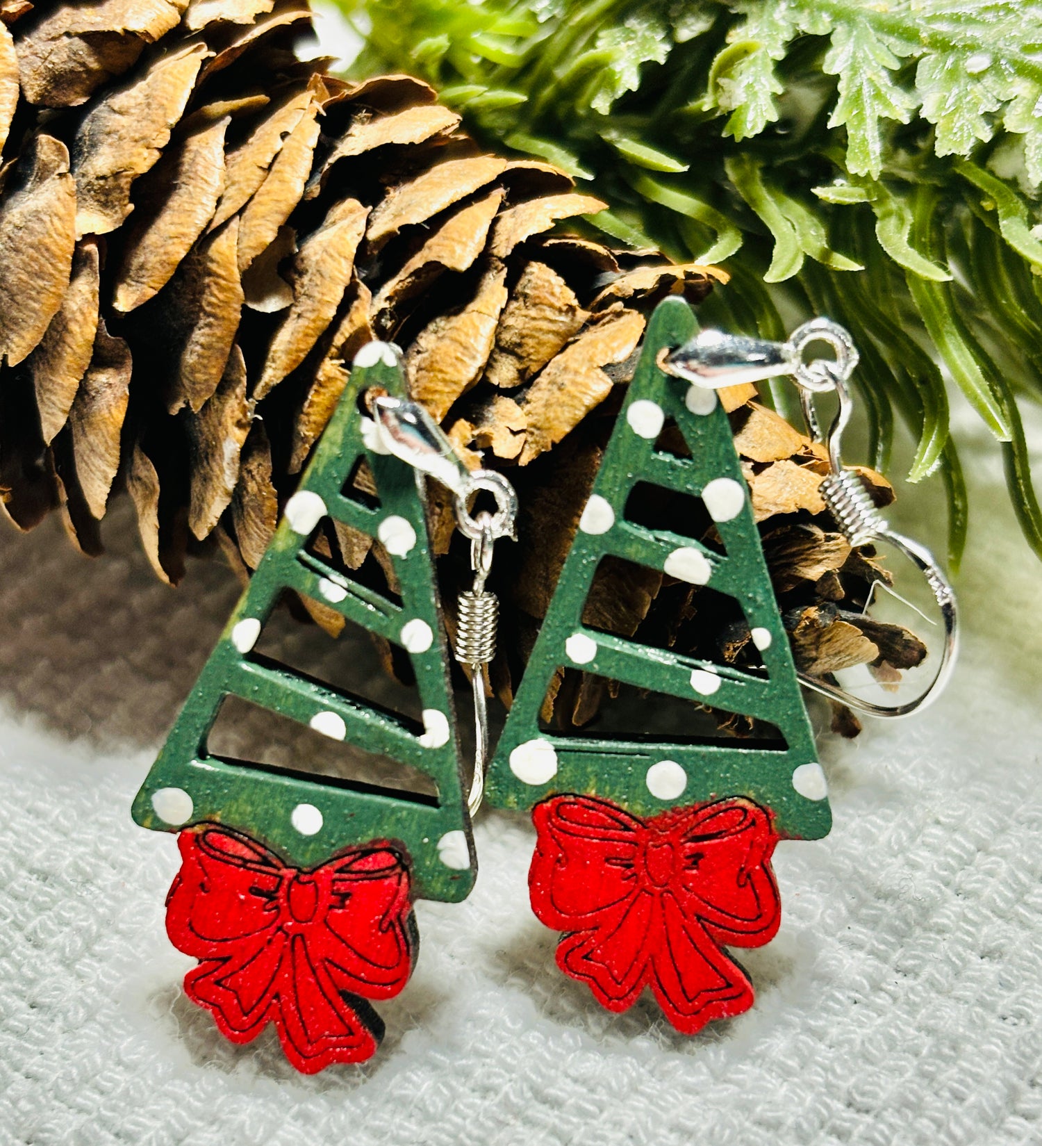 Add a playful touch to your outfit with this unique one piece earring featuring a tree with a vibrant red bow. Embrace your quirky side with this fun accessory.
