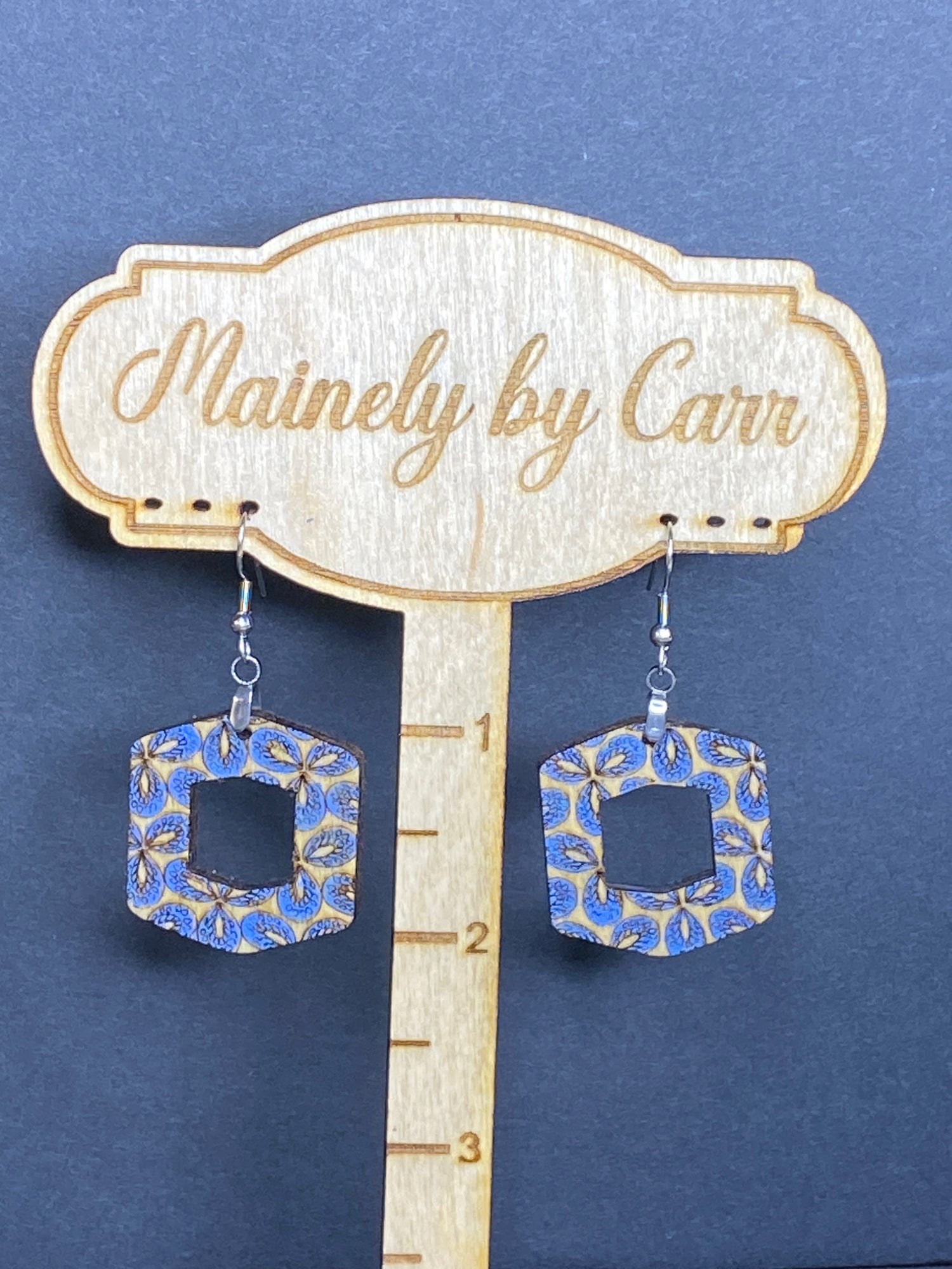 Give your look a unique artistic touch with these one-of-a-kind Wooden Hexagon, Paisley Earrings. Hand painted in a beautiful medium blue shade, they feature a stylish hexagon shape with a subtle paisley design that adds a hint of sophistication. Stand out from the crowd and make a statement with these beautiful earrings!